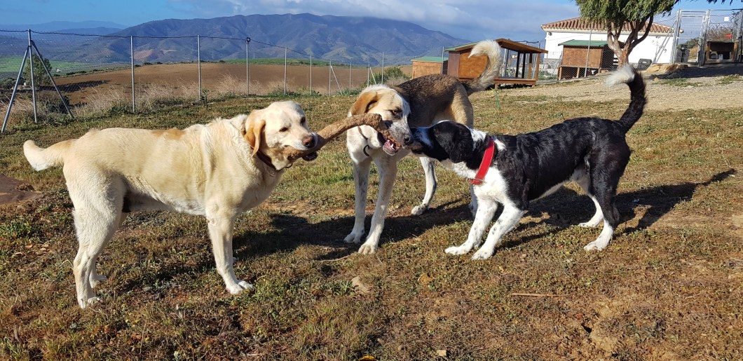 Schroeder, Pepe und Akido beim Spiel, wer bekommt den Stock?