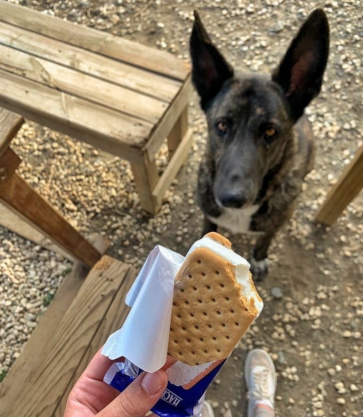 Eis darf der liebe Emil sowie auch alle anderen Hunde zwar nicht futtern, aber dafür bekommt er stattdessen reichlich andere Leckereien. Brav „Sitz“ macht er dabei jedes Mal.