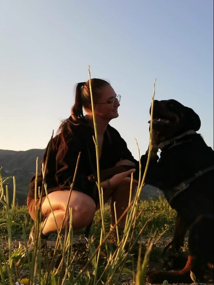 Me llevo genial con las personas, me encanta pasear y jugar con ellas. Con los demás perritos no me llevo muy bien… lo estamos trabajando con nuestra adiestradora Jasmin, que tiene mucha paciencia conmigo.